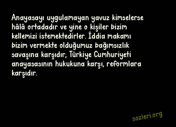 Anayasayı uygulamayan yavuz kimselerse hâlâ ortadadır ve yine o kişiler bizim kellemizi istemektedirler. İddia makamı bizim vermekte olduğumuz bağımsızlık savaşına karşıdır, Türkiye Cumhuriyeti anayasasının hukukuna karşı, reformlara karşıdır. ( Deniz Gezmiş )