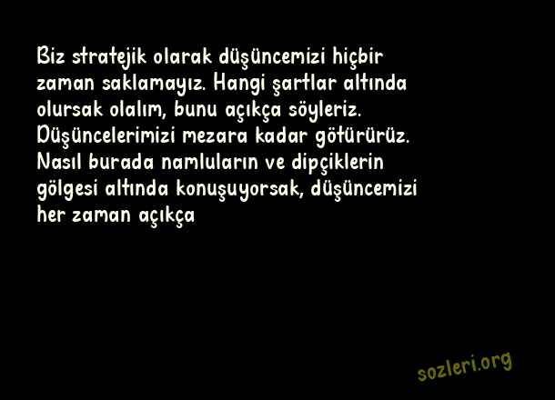 Biz stratejik olarak düşüncemizi hiçbir zaman saklamayız. Hangi şartlar altında olursak olalım, bunu açıkça söyleriz. Düşüncelerimizi mezara kadar götürürüz. Nasıl burada namluların ve dipçiklerin gölgesi altında konuşuyorsak, düşüncemizi her zaman açıkça ( Deniz Gezmiş )