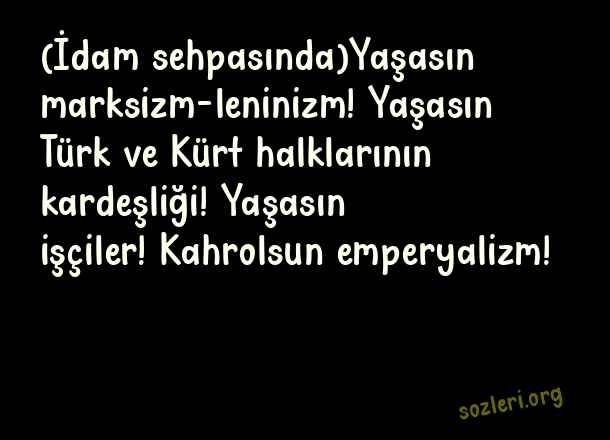 (İdam sehpasında)Yaşasın marksizm-leninizm! Yaşasın Türk ve Kürt halklarının kardeşliği! Yaşasın işçiler! Kahrolsun emperyalizm! ( Deniz Gezmiş )