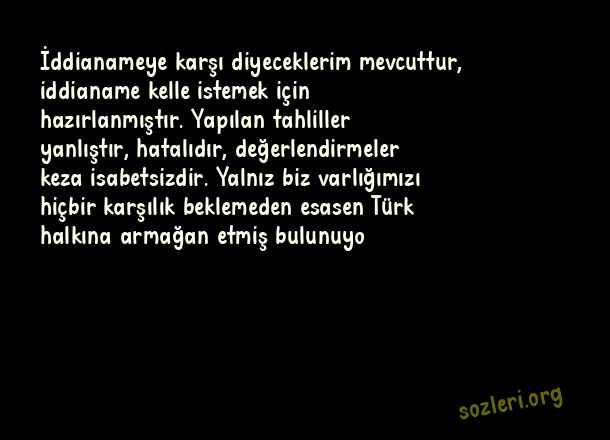 İddianameye karşı diyeceklerim mevcuttur, iddianame kelle istemek için hazırlanmıştır. Yapılan tahliller yanlıştır, hatalıdır, değerlendirmeler keza isabetsizdir. Yalnız biz varlığımızı hiçbir karşılık beklemeden esasen Türk halkına armağan etmiş bulunuyo ( Deniz Gezmiş )