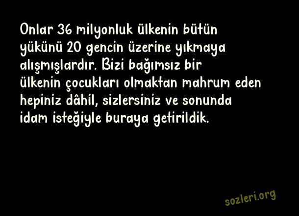 Onlar 36 milyonluk ülkenin bütün yükünü 20 gencin üzerine yıkmaya alışmışlardır. Bizi bağımsız bir ülkenin çocukları olmaktan mahrum eden hepiniz dâhil, sizlersiniz ve sonunda idam isteğiyle buraya getirildik. ( Deniz Gezmiş )