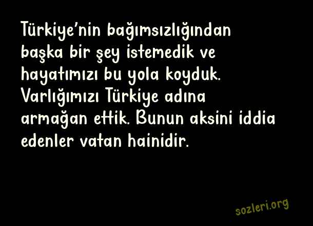 Türkiye’nin bağımsızlığından başka bir şey istemedik ve hayatımızı bu yola koyduk. Varlığımızı Türkiye adına armağan ettik. Bunun aksini iddia edenler vatan hainidir. ( Deniz Gezmiş )