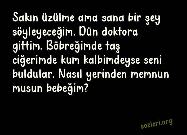 Sakın üzülme ama sana bir şey söyleyeceğim. Dün doktora gittim. Böbreğimde taş ciğerimde kum kalbimdeyse seni buldular. Nasıl yerinden memnun musun bebeğim? ( Derin Aşk )