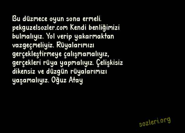 Bu düzmece oyun sona ermeli. Kendi benliğimizi bulmalıyız. Yol verip yakarmaktan vazgeçmeliyiz. Rüyalarımızı gerçekleştirmeye çalışmamalıyız, gerçekleri rüya yapmalıyız. Çelişkisiz dikensiz ve düzgün rüyalarımızı yaşamalıyız. Oğuz Atay ( Diken )