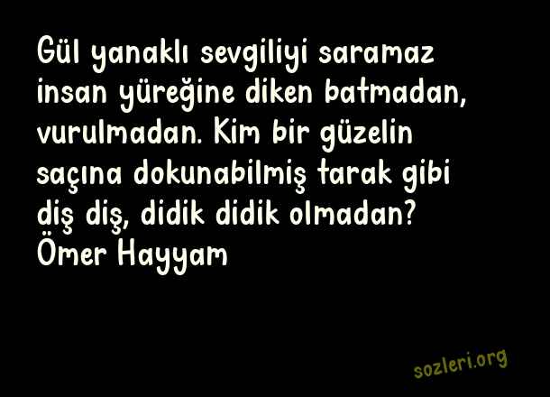 Gül yanaklı sevgiliyi saramaz insan yüreğine diken batmadan, vurulmadan. Kim bir güzelin saçına dokunabilmiş tarak gibi diş diş, didik didik olmadan? Ömer Hayyam ( Diken )