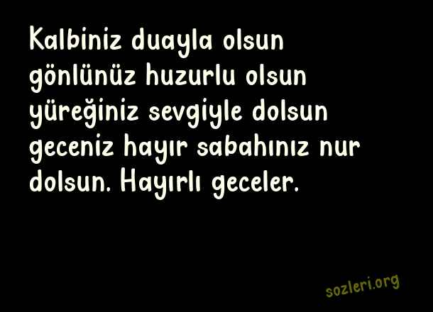 Kalbiniz duayla olsun gönlünüz huzurlu olsun yüreğiniz sevgiyle dolsun geceniz hayır sabahınız nur dolsun. Hayırlı geceler. ( Dini İyi Geceler )