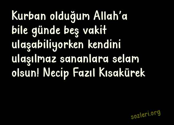 Kurban olduğum Allah’a bile günde beş vakit ulaşabiliyorken kendini ulaşılmaz sananlara selam olsun! Necip Fazıl Kısakürek ( Dini Kapak Sözler )