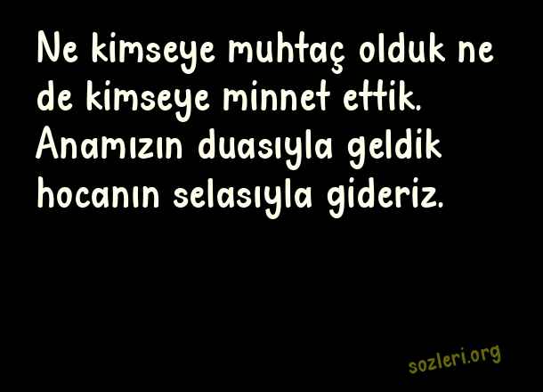 Ne kimseye muhtaç olduk ne de kimseye minnet ettik. Anamızın duasıyla geldik hocanın selasıyla gideriz. ( Dini Kapak Sözler )