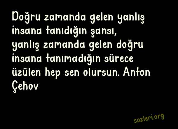 Doğru zamanda gelen yanlış insana tanıdığın şansı, yanlış zamanda gelen doğru insana tanımadığın sürece üzülen hep sen olursun. Anton Çehov ( Doğru İnsan )