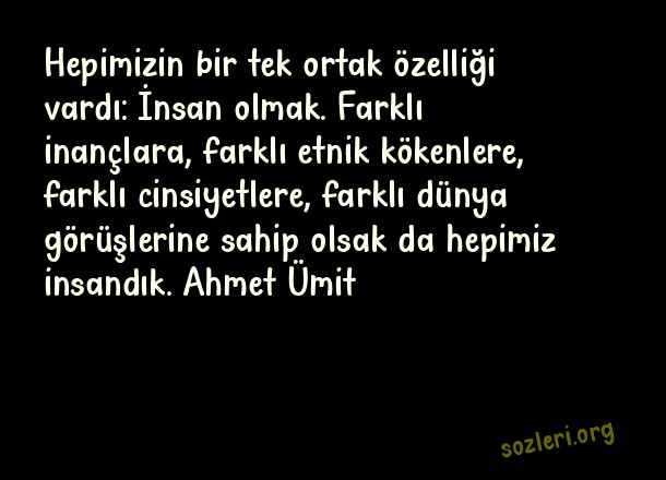 Hepimizin bir tek ortak özelliği vardı: İnsan olmak. Farklı inançlara, farklı etnik kökenlere, farklı cinsiyetlere, farklı dünya görüşlerine sahip olsak da hepimiz insandık. Ahmet Ümit ( Doğru İnsan )