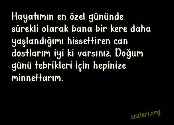 Hayatımın en özel gününde sürekli olarak bana bir kere daha yaşlandığımı hissettiren can dostlarım iyi ki varsınız. Doğum günü tebrikleri için hepinize minnettarım. ( Doğum Günü Kutlayanlara Teşekkür Mesajı )