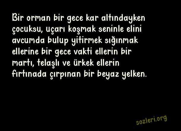 Bir orman bir gece kar altındayken çocuksu, uçarı koşmak seninle elini avcumda bulup yitirmek sığınmak ellerine bir gece vakti ellerin bir martı, telaşlı ve ürkek ellerin fırtınada çırpınan bir beyaz yelken. ( Dokunaklı Sözler )
