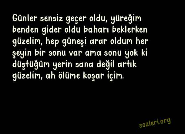 Günler sensiz geçer oldu, yüreğim benden gider oldu baharı beklerken güzelim, hep güneşi arar oldum her şeyin bir sonu var ama sonu yok ki düştüğüm yerin sana değil artık güzelim, ah ölüme koşar içim. ( Dokunaklı Sözler )
