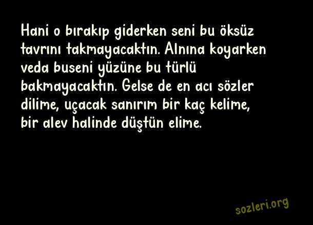 Hani o bırakıp giderken seni bu öksüz tavrını takmayacaktın. Alnına koyarken veda buseni yüzüne bu türlü bakmayacaktın. Gelse de en acı sözler dilime, uçacak sanırım bir kaç kelime, bir alev halinde düştün elime. ( Dokunaklı Sözler )