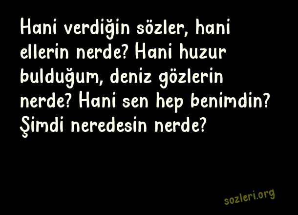 Hani verdiğin sözler, hani ellerin nerde? Hani huzur bulduğum, deniz gözlerin nerde? Hani sen hep benimdin? Şimdi neredesin nerde? ( Dokunaklı Sözler )