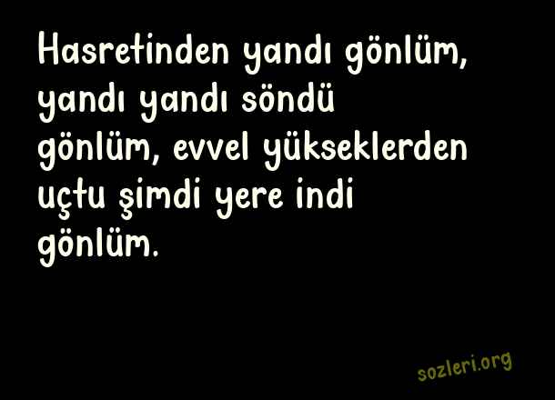 Hasretinden yandı gönlüm, yandı yandı söndü gönlüm, evvel yükseklerden uçtu şimdi yere indi gönlüm. ( Dokunaklı Sözler )