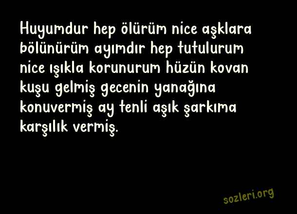 Huyumdur hep ölürüm nice aşklara bölünürüm ayımdır hep tutulurum nice ışıkla korunurum hüzün kovan kuşu gelmiş gecenin yanağına konuvermiş ay tenli aşık şarkıma karşılık vermiş. ( Dokunaklı Sözler )