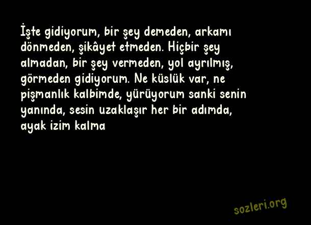 İşte gidiyorum, bir şey demeden, arkamı dönmeden, şikâyet etmeden. Hiçbir şey almadan, bir şey vermeden, yol ayrılmış, görmeden gidiyorum. Ne küslük var, ne pişmanlık kalbimde, yürüyorum sanki senin yanında, sesin uzaklaşır her bir adımda, ayak izim kalma ( Dokunaklı Sözler )
