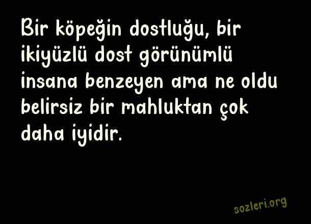 Bir köpeğin dostluğu, bir ikiyüzlü dost görünümlü insana benzeyen ama ne oldu belirsiz bir mahluktan çok daha iyidir. ( Dost Satanlara Sözler )