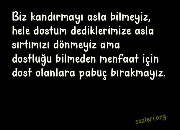 Biz kandırmayı asla bilmeyiz, hele dostum dediklerimize asla sırtımızı dönmeyiz ama dostluğu bilmeden menfaat için dost olanlara pabuç bırakmayız. ( Dost Satanlara Sözler )