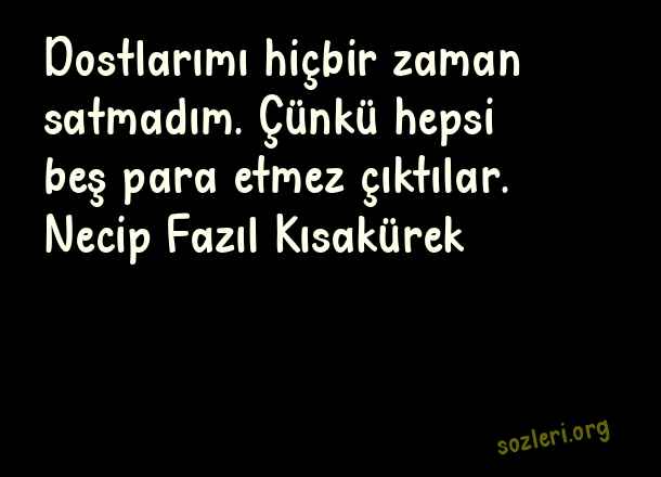 Dostlarımı hiçbir zaman satmadım. Çünkü hepsi beş para etmez çıktılar. Necip Fazıl Kısakürek ( Dost Satanlara Sözler )