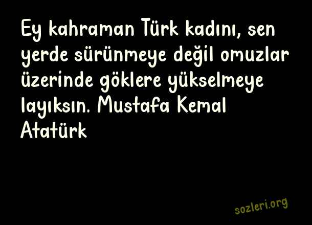 Ey kahraman Türk kadını, sen yerde sürünmeye değil omuzlar üzerinde göklere yükselmeye layıksın. Mustafa Kemal Atatürk ( 8 Mart Dünya Kadınlar Günü )