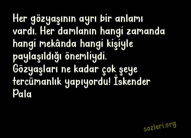 Her gözyaşının ayrı bir anlamı vardı. Her damlanın hangi zamanda hangi mekânda hangi kişiyle paylaşıldığı önemliydi. Gözyaşları ne kadar çok şeye tercümanlık yapıyordu! İskender Pala ( Dünyaca Ünlü Sözler )