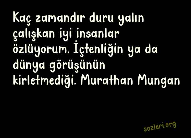 Kaç zamandır duru yalın çalışkan iyi insanlar özlüyorum. İçtenliğin ya da dünya görüşünün kirletmediği. Murathan Mungan ( Dünyaca Ünlü Sözler )