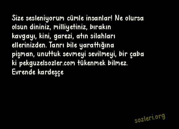 Size sesleniyorum cümle insanlar! Ne olursa olsun dininiz, milliyetiniz, bırakın kavgayı, kini, garezi, atın silahları ellerinizden. Tanrı bile yarattığına pişman, unuttuk sevmeyi sevilmeyi, bir çaba ki tükenmek bilmez. Evrende kardeşçe ( Dünyaca Ünlü Sözler )