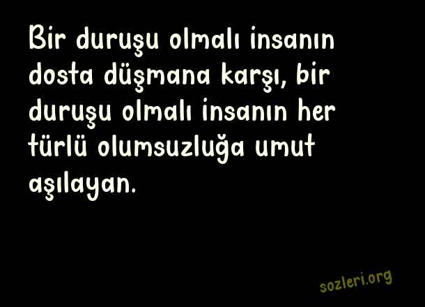 Bir duruşu olmalı insanın dosta düşmana karşı, bir duruşu olmalı insanın her türlü olumsuzluğa umut aşılayan. ( Duruş )