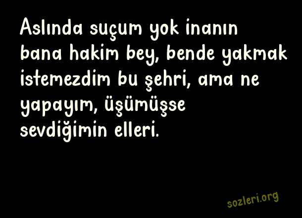 Aslında suçum yok inanın bana hakim bey, bende yakmak istemezdim bu şehri, ama ne yapayım, üşümüşse sevdiğimin elleri. ( Duygulu Mesajlar )