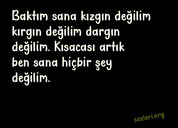 Baktım sana kızgın değilim kırgın değilim dargın değilim. Kısacası artık ben sana hiçbir şey değilim. ( Efsane Sözler )