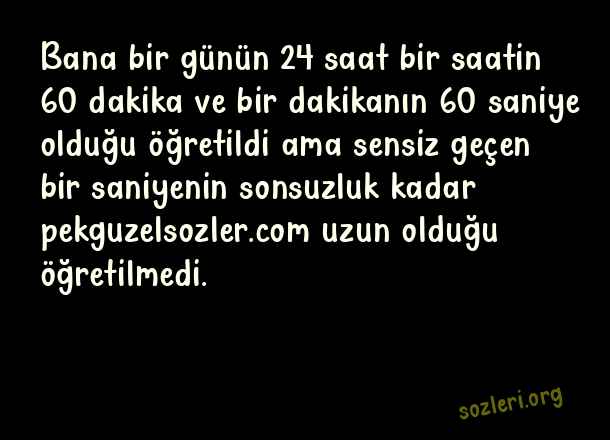 Bana bir günün 24 saat bir saatin 60 dakika ve bir dakikanın 60 saniye olduğu öğretildi ama sensiz geçen bir saniyenin sonsuzluk kadar uzun olduğu öğretilmedi. ( Efsane Sözler )