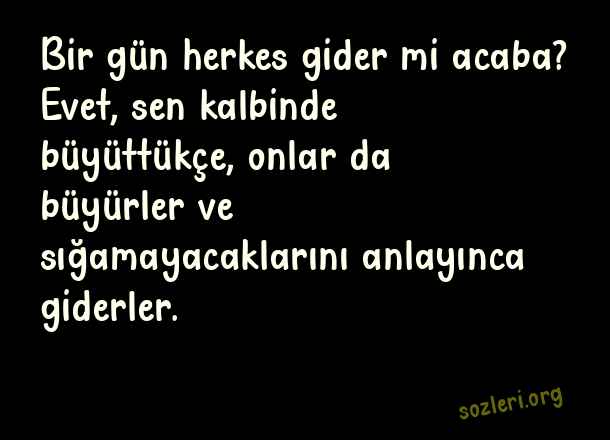 Bir gün herkes gider mi acaba? Evet, sen kalbinde büyüttükçe, onlar da büyürler ve sığamayacaklarını anlayınca giderler. ( Efsane Sözler )