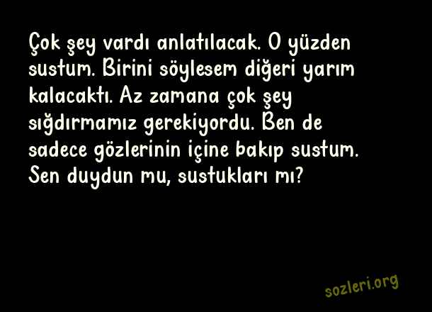 Çok şey vardı anlatılacak. O yüzden sustum. Birini söylesem diğeri yarım kalacaktı. Az zamana çok şey sığdırmamız gerekiyordu. Ben de sadece gözlerinin içine bakıp sustum. Sen duydun mu, sustukları mı? ( Efsane Sözler )