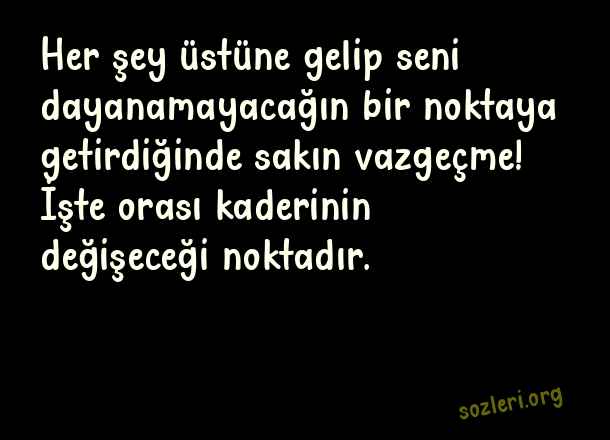 Her şey üstüne gelip seni dayanamayacağın bir noktaya getirdiğinde sakın vazgeçme! İşte orası kaderinin değişeceği noktadır. ( Efsane Sözler )
