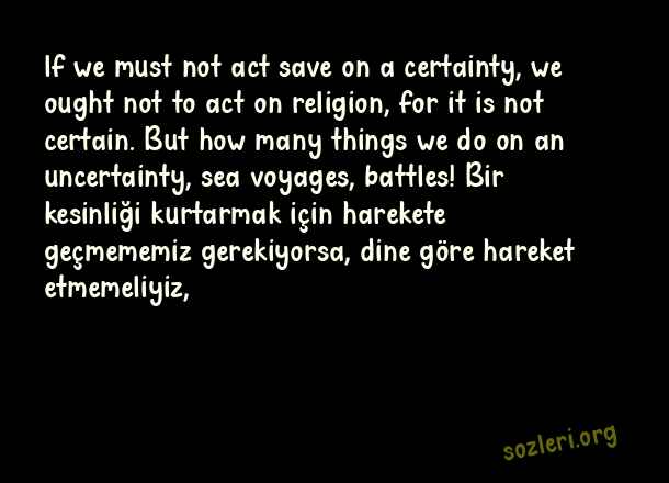 lf we must not act save on a certainty, we ought not to act on religion, for it is not certain. But how many things we do on an uncertainty, sea voyages, battles! Bir kesinliği kurtarmak için harekete geçmememiz gerekiyorsa, dine göre hareket etmemeliyiz, ( Deniz İle İlgili İngilizce Sözler )