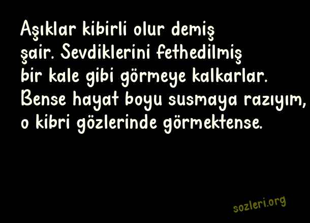 Aşıklar kibirli olur demiş şair. Sevdiklerini fethedilmiş bir kale gibi görmeye kalkarlar. Bense hayat boyu susmaya razıyım, o kibri gözlerinde görmektense. ( Elif Şafak Aşk )