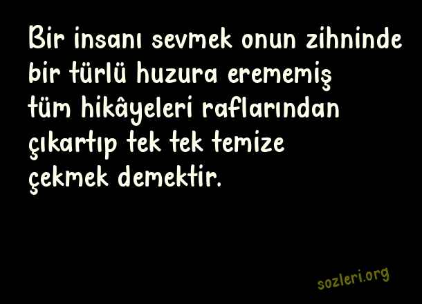 Bir insanı sevmek onun zihninde bir türlü huzura erememiş tüm hikâyeleri raflarından çıkartıp tek tek temize çekmek demektir. ( Elif Şafak Aşk )