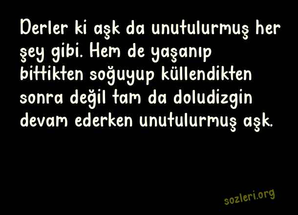 Derler ki aşk da unutulurmuş her şey gibi. Hem de yaşanıp bittikten soğuyup küllendikten sonra değil tam da doludizgin devam ederken unutulurmuş aşk. ( Elif Şafak Aşk )
