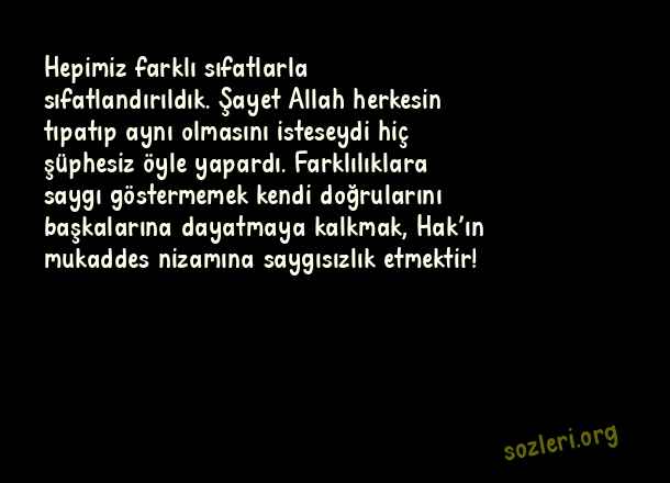 Hepimiz farklı sıfatlarla sıfatlandırıldık. Şayet Allah herkesin tıpatıp aynı olmasını isteseydi hiç şüphesiz öyle yapardı. Farklılıklara saygı göstermemek kendi doğrularını başkalarına dayatmaya kalkmak, Hak’ın mukaddes nizamına saygısızlık etmektir! ( Elif Şafak Aşk )