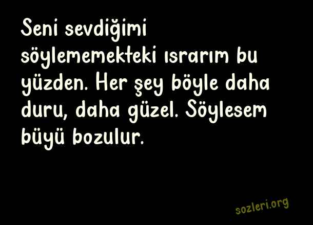 Seni sevdiğimi söylememekteki ısrarım bu yüzden. Her şey böyle daha duru, daha güzel. Söylesem büyü bozulur. ( Elif Şafak Aşk )