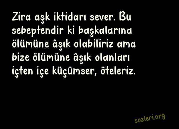 Zira aşk iktidarı sever. Bu sebeptendir ki başkalarına ölümüne âşık olabiliriz ama bize ölümüne âşık olanları içten içe küçümser, öteleriz. ( Elif Şafak Aşk )