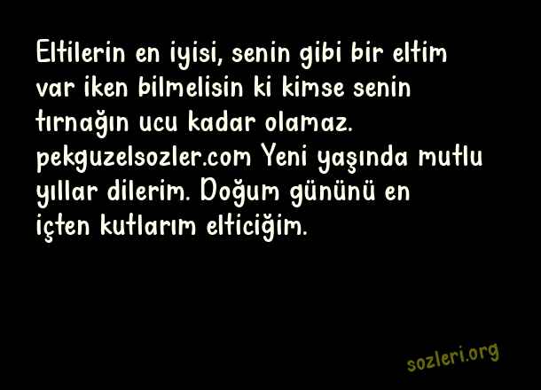 Eltilerin en iyisi, senin gibi bir eltim var iken bilmelisin ki kimse senin tırnağın ucu kadar olamaz. Yeni yaşında mutlu yıllar dilerim. Doğum gününü en içten kutlarım elticiğim. ( Eltiye Doğum Günü )