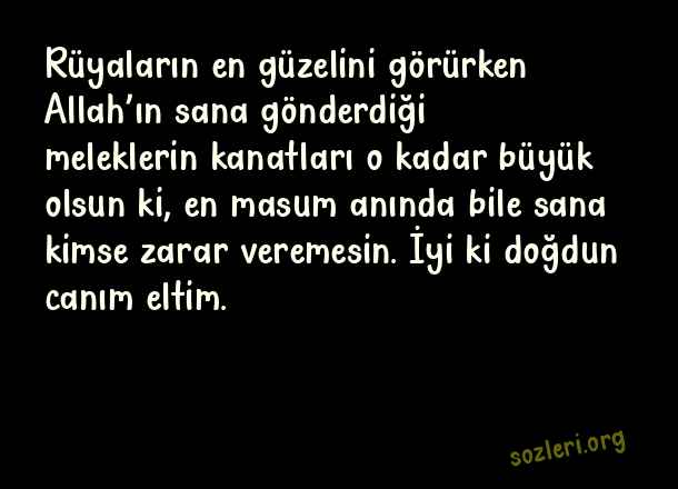 Rüyaların en güzelini görürken Allah’ın sana gönderdiği meleklerin kanatları o kadar büyük olsun ki, en masum anında bile sana kimse zarar veremesin. İyi ki doğdun canım eltim. ( Eltiye Doğum Günü )