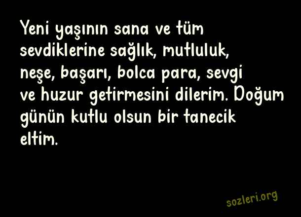 Yeni yaşının sana ve tüm sevdiklerine sağlık, mutluluk, neşe, başarı, bolca para, sevgi ve huzur getirmesini dilerim. Doğum günün kutlu olsun bir tanecik eltim. ( Eltiye Doğum Günü )
