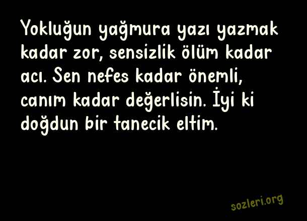 Yokluğun yağmura yazı yazmak kadar zor, sensizlik ölüm kadar acı. Sen nefes kadar önemli, canım kadar değerlisin. İyi ki doğdun bir tanecik eltim. ( Eltiye Doğum Günü )