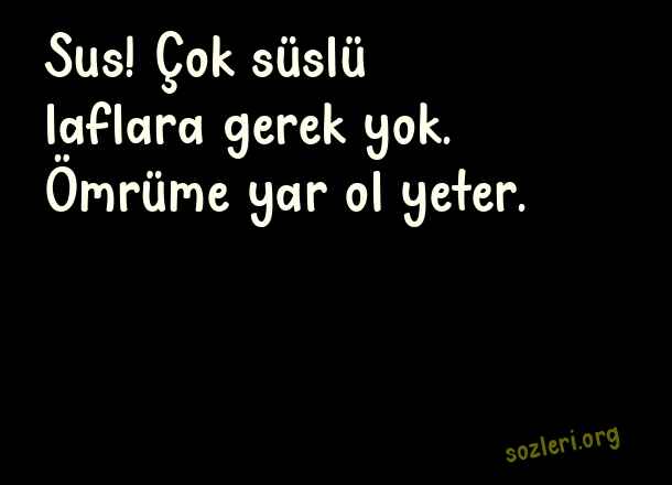 Sus! Çok süslü - En Çok Paylaşılan Sevgi Sözleri .. Sus! Çok süslü laflara gerek yok. Ömrüme yar ol yeter. ( En Çok Paylaşılan Sevgi )