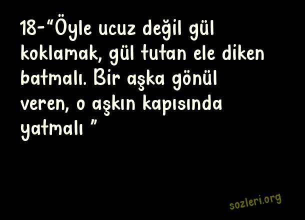 18-“Öyle ucuz değil gül koklamak, gül tutan ele diken batmalı. Bir aşka gönül veren, o aşkın kapısında yatmalı…” ( En Güzel 20 Aşk Sözü )