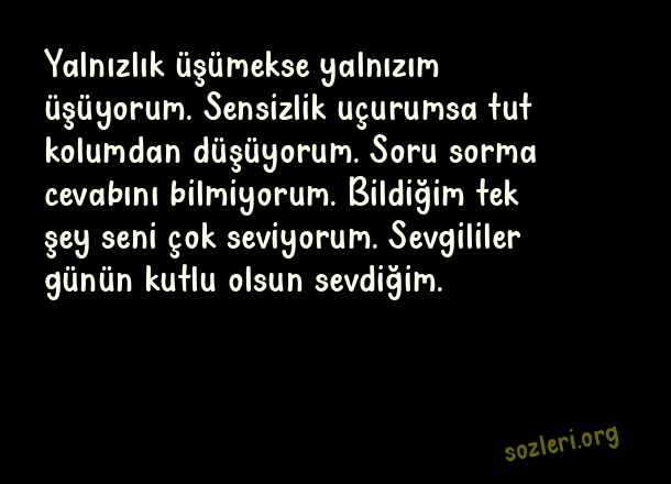 Yalnızlık üşümekse yalnızım üşüyorum. Sensizlik uçurumsa tut kolumdan düşüyorum. Soru sorma cevabını bilmiyorum. Bildiğim tek şey seni çok seviyorum. Sevgililer günün kutlu olsun sevdiğim. ( En Güzel Sevgililer Günü )